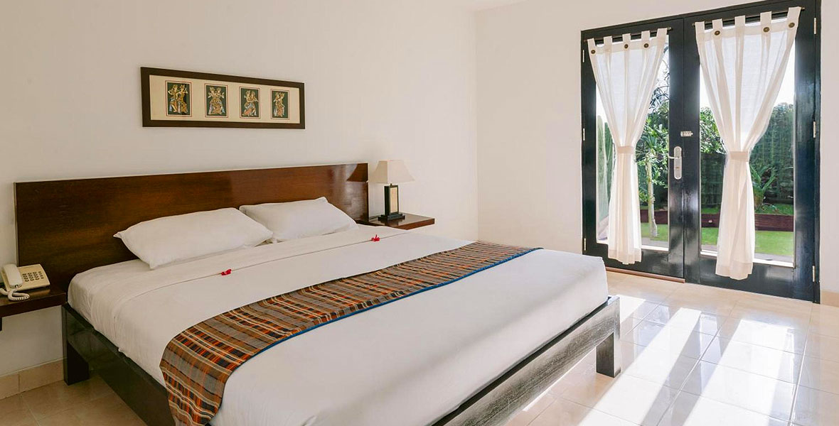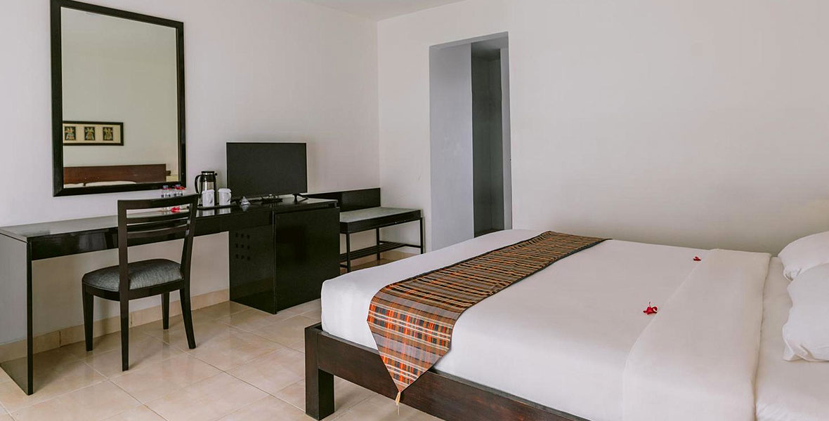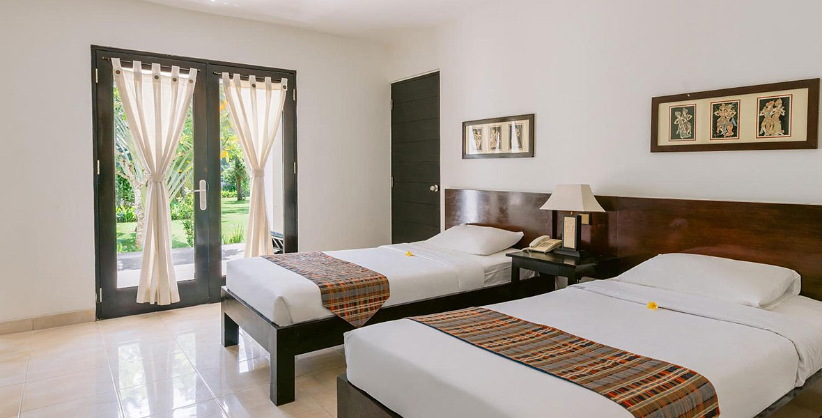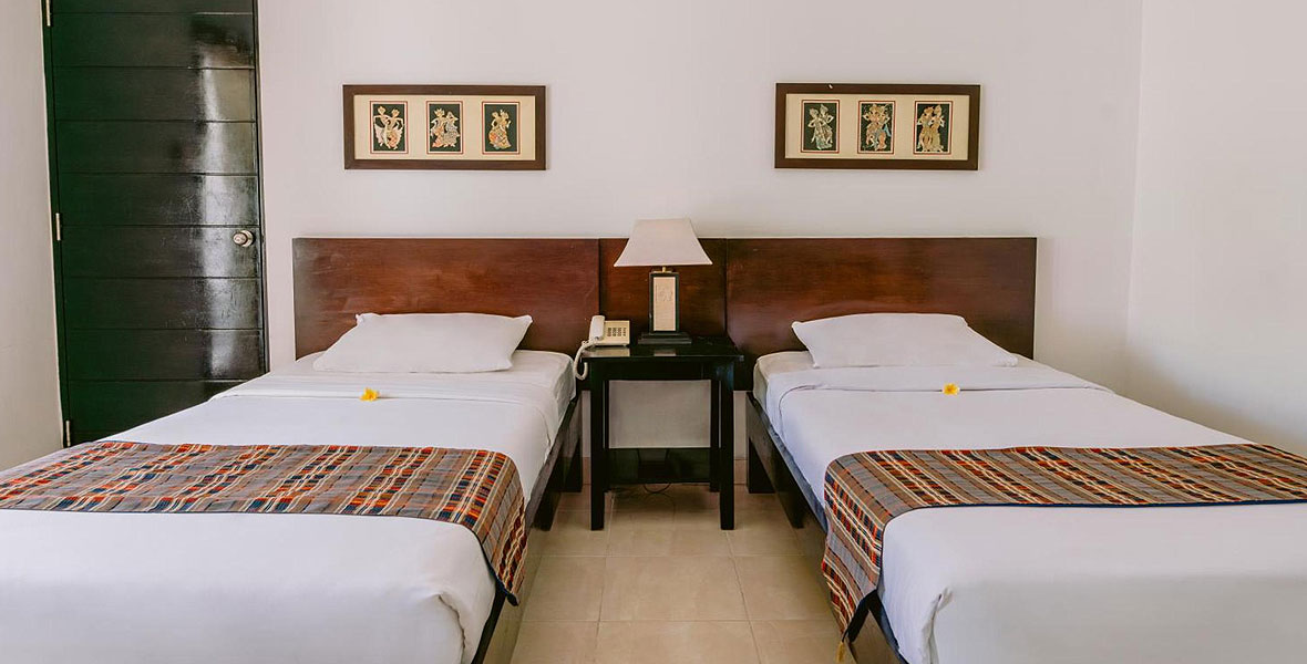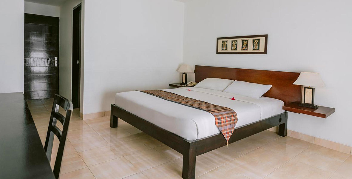 Deluxe room at Legong Keraton Beach Hotel offers a spacious bedroom with 44 square meter in size and consists of 1 queen bed or 2 single beds base on guest preference, and can acccomodate for 2 adult plus 1 children. All room has private bathroom, balcony/terrace with garden view, and Free Wi-Fi in all rooms!.!
